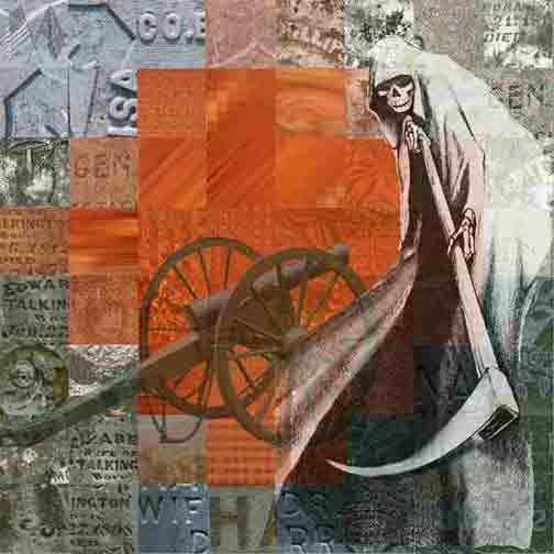The Off-Kilter Quilters 2007 Challenge was to illustrate three words (each starting with the same letter of the alphabet drawn from a hat) using only two colors (also drawn from a hat). I drew the letter A and the colors charcoal and rust. I had just returned from a trip to Arkansas where I found the grave of my Great Great Great grandparents. In researching them, I found that they had lost two sons, two daughters, and two sons-in-law to the horror of the Civil War (they supported the Union but lived in a Confederate state). I created my challenge quilt digitally using 2-inch squares as a base that were cut from photos of their headstone and the red Arkansas clay soil. On these, I superimposed a sketch of the Grim Reaper and my photo of a canon on the site of the battlefield where two of their sons were killed. As you can imagine, my entry had a very different mood than the rest, which were playful and light-hearted.