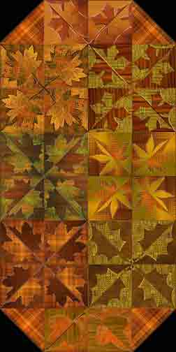 I created Autumn Leaves to be a project in Piecing with Pixels. I cut leaf shapes from 14 digital fabric designs using 6 Elements Cookie Cutters, divided them in half diagonally and re-combined them to create an interesting overall design. It has proved to be a useful little table-topper for the fall. The patterns and Digital Stash to make this quilt may be purchased and downloaded from www.creatingwithpixels.com or purchased as a"Quilt Kit on CD".