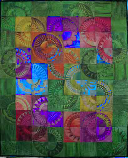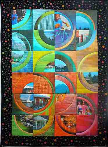 A heap of photos taken during a wonderful trip across Canada begged for a special quilt to display them. I selected 24 representative pictures and started playing around with Photoshop Elements filters (to create the increasingly abstract"mats" behind each picture) and the Quarter Circle Cookie Cutters to cut the shapes from the filtered versions of each photo. I arranged the pictures and then created the fabric for the border by repeatedly applying the"motion blur" filter to copies of the blocks around the edges of the quilt and adding a little digital brush work. I printed the top on paper-backed, treated fabric, added the border and quilted the top with interlocking concentric circles.