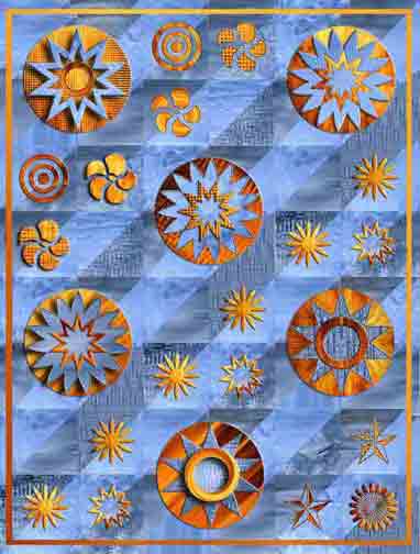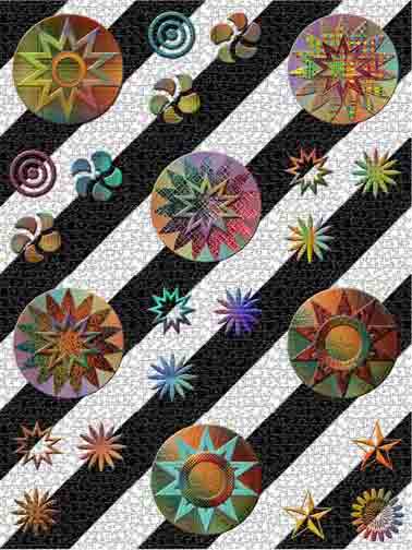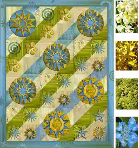 Flowers and Stars is one of the two sample that Gudny Campbell and I created for our article in the January 2008 issue of American Quilter. For my version, I created a Digital Stash by applying Photoshop Elements filters to photos of 3 flowers (hyacinth, hydrangea, and forsythia) and the herb marjoram. I created the blocks by layering shapes cut from this stash with the Elements Cookie Cutter tool. The patterns and Digital Stash to make this quilt may be purchased and downloaded from www.creatingwithpixels.com or purchased as a"Quilt Kit on CD".