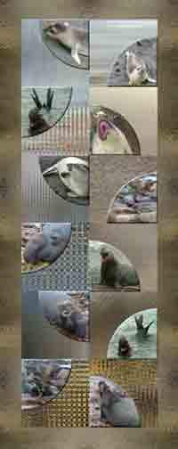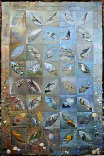 I created Coastal Ovals from my Beach Digital Stash (available on www.creatingwithpixels.com ). The designs are based on photographs of California beach scenes, skies, flora, and fauna. Each 4.5-inch block has two, overlapping "backgrounds" exposing a pointed oval window showing a close-up photo of coastal wildlife. The quilt is embellished with beads and shells. In"Piecing with Pixels". By Sandra Hart and Gudny Campbell. AQS, Feb 2009