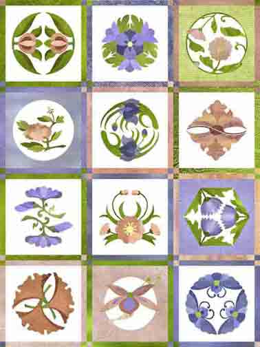 This is a new twist on an old favorite; arcs, spikes, and other shapes were (digitally) cut from a (digital) stash based on photos of flowers and leaves and combined (digitally) into a beautiful quilt top that was printed on large sheets of paper-backed, treated cotton. When quilted, he results look much like a traditional New York Beauty, but without laboriously paper piecing the spikes and sewing together curved edges! See "Piecing with Pixels" for instructions about how to create similar blocks. The patterns and Digital Stash to make this quilt may be purchased and downloaded from the shop.