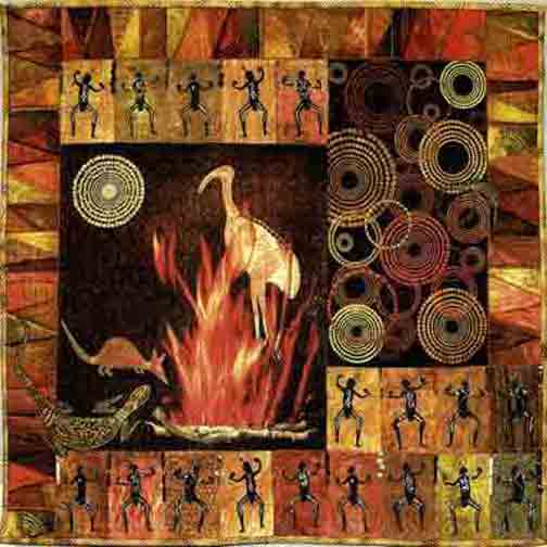 The Fire Makers is part of a special exhibit called Dreaming the Earth that illustrate the creation stories of the indigenous peoples of Australia. This collection of quilts was originally made to honor the extensive Australian plant collection of the UCSC Arboretum. The Fire Makers illustrates how people got fire from Bootoolgah the Crane and Goonar, the Kangaroo Rat. The fabrics and shapes were created in Photoshop Elements, printed on broadcloth, quilted, and then embellished with a variety of fibers and hundreds of small shells, pieces of bone, wood, and stones. The creation stories that were illustrated and other quilts in the exhibit may be seen on:
