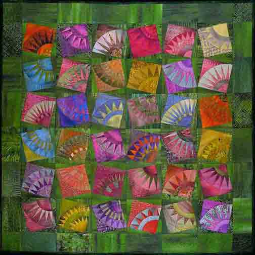 Using Elements Cookie Cutter shapes and instructions by Gudny Campbell in Piecing with Pixels, I played with a close up photo of a moss-covered redwood tree to create this abstract, geometric image. Parts of the original image were used to create the border and machine quilted. In Piecing with Pixels, By Sandra Hart and Gudny Campbell. AQS, Feb 2009