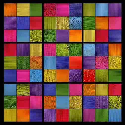 This wall hanging started life as a Suduko puzzle completed by Gudny Campbell that she transformed into an Excel spreadsheet/pattern. Each of us made several quilts, substituting graphic images for numbers. For mine, I created a digital stash of 81 digital patterns (9 of each color) using Photoshop Elements filters to digitally transform pictures of flowers in my garden. Many of these digital designs are available for purchase and download from www.creatingwithpixels.com.