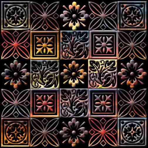 This simple but elegant quilt is a project in Piecing with Pixels. It was created with one Photoshop Elements Cookie Cutter shape (Leaf Ornament 1), the paint bucket (Black), and one Layer Style (Patterns-Ancient Stone). The digitally pieced quilt top was printed on broadcloth and machine quilted. In Piecing with Pixels. By Sandra Hart and Gudny Campbell. American Quilter's Society, Feb 2009