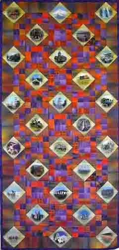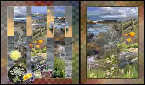 When invited to teach a 5-day Empty Spools seminar at Asilomar, I asked Gudny Campbell to join me. We had 3 days to create a quilt to illustrate our class (Technology. A Quilter's best Friend) for the brochure. We had just met, it was our first collaboration, she used a PC and I used a Mac, and we had to work separately, communicating by phone and email. A daunting challenge! I created five vertical strips. blending images of Asilomar that I had photographed over the years. Gudny selected three, positioned them on her enlarged photo of the coast, and added additional images on top. Since we created the original quilt, both Gudny and I have used elements of it to make different versions. One of mine is shown here. The other, using the two collages that were not included in Seacolor, became Asilomar Evenings.