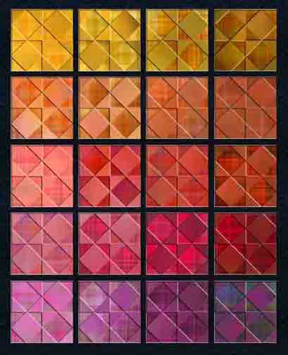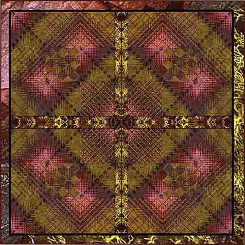 I made Just Roses with my Plaids Plus Digital Stash (available on www.creatingwithpixels.com ). I created this stash, composed of plaids and variegated "solids", by applying Elements filters to photos of roses. Each block consists of four squares and four diamonds cut from plaid/solid pairs using Elements Cookie Cutter Shapes set off by bevels and shadows. The patterns and Digital Stash to make this quilt may be purchased and downloaded from www.creatingwithpixels.com Pictured in Piecing with Pixels by Sandra Hart and Gudny Campbell, AQS, 2009.