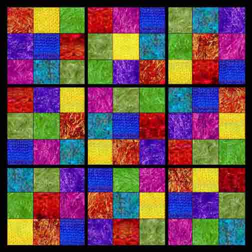 This wall hanging started life as a Suduko puzzle completed by Gudny Campbell that she transformed into an Excel spreadsheet/pattern. Each of us made several quilts, substituting graphic images for numbers. Rainbow Suduko transforms a the numbers in the original puzzle into a rainbow of nine close ups of knitting done with chunky yarn or"fun fur".
