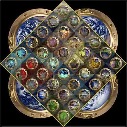 Portholes is composed of 36 images of earth photographed from space by astronauts or satellites, downloaded from NASA & USGS websites, placed behind brass portholes and displayed on half-square triangles filled with textures developed in Photoshop Elements using the original images as starting points. To me, each of the images look like jewels; cabochons in a brass setting.