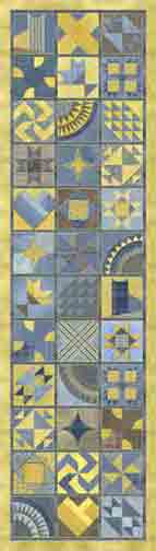 I made this quilt to test all of the Layered Templates that I put on our digital store (www.creatingwithpixels.com ) and to make something pretty to decorate the end of my queen-sized bed. I selected dozens of"fabrics" from my blue and yellow stashes and then created each of the blocks. I surrounded each block with a sash (a blue pattern with shiny-looking circles on it) and a yellow border and then printed the whole thing on paper-backed, treated broadcloth.