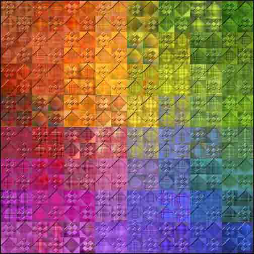 Square Cookies is based on a simple 9-patch tipped 45 degrees and positioned on alternate blocks. Each set of four blocks is filled with a different combination of plaids and coordinating blended solids created by applying Photoshop Elements filters to dozens of photos, given dimension by bevels and shadows. The patterns and Digital Stash to make this quilt may be purchased and downloaded from www.creatingwithpixels.com In Piecing with Pixels by Sandra Hart and Gudny Campbell, AQS, 2009.