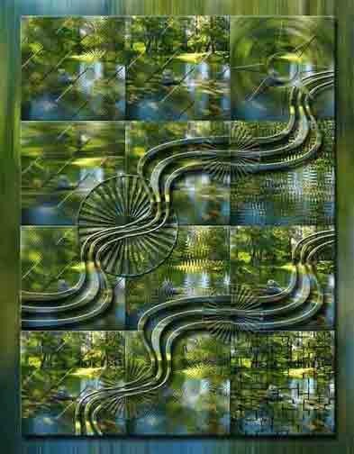 Using a set of instructions developed by Gudny Campbell (in Piecing with Pixels), I started with a photo that I took in beautiful Victoria Park in Montreal and applied Elements filters to copies of the original image until I had a group that pleased me. After I superimposed other shapes, also cut from the original image using Elements Cookie Cutters, on top of some of them, I printed the completed top on paper-backed, treated fabric on a wide-format printer. In,"Piecing with Pixels". By Sandra Hart and Gudny Campbell. AQS, 2009