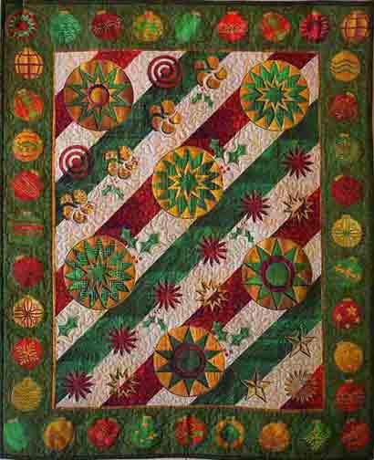 Christmas Cookies is based on a design developed by Gudny Campbell and me, described in our article in the January 2008 issue of American Quilter. I created my Digital Stash by applying Photoshop Elements filters to photos of red roses, deep green leaves, and flowers with creamy petals. I created the blocks by layering shapes cut from this stash with the Elements Cookie Cutter tool. The border is decorated with Christmas ornaments also created in Elements. Digital templates and stash to make this quilt as well as the ornaments that decorate the border are available for download from our shop or purchased as a"Quilt Kit on CD.
