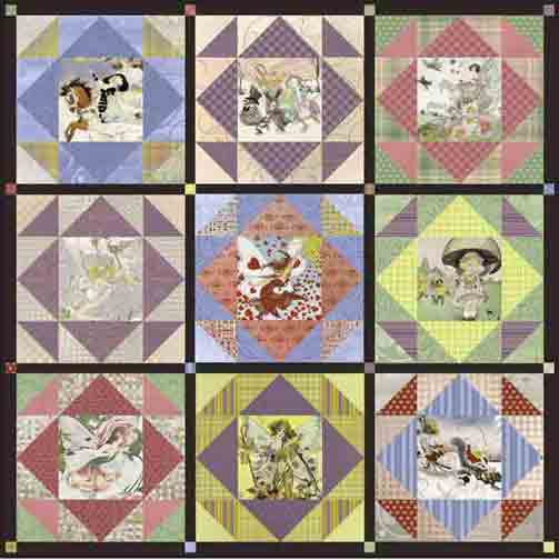 I created this little quilt to showcase 9 illustrations copied by Val Vavrik from a very old, rare book originally published in the early 1900s and a stash of digital fabric designs that I created using the colors and textures of these pictures as a starting point. I created a sweet little quilt using the traditional Connecticut pattern, a new twist on an old favorite. Digitized versions of the fairy pictures, fabric stash, and the pattern are available for purchase and download from www.creatingwithpixels.com or as a"Quilt Kit on CD".