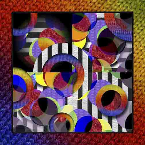 This small wall hanging was created using instructions written by Gudny Campbell in Piecing with Pixels. After I completed the basic layout, I filled some sections with close up photos of knitting with funky fun fur and hand dyed wool. The border is an extreme close-up of a small section of stockinette stitch knitted with rainbow-hued wool. In,"Piecing with Pixels". By Sandra Hart and Gudny Campbell. American Quilter's Society, Feb 2009